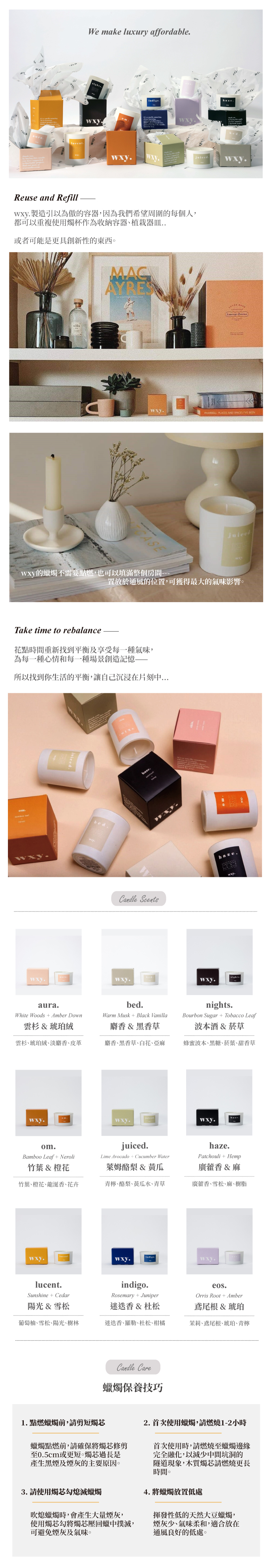 -wxy 設計的日常氣味蠟燭,100%植物蠟製作,完美契合你的心情,每日都讓自己沉浸在經典的香味中...