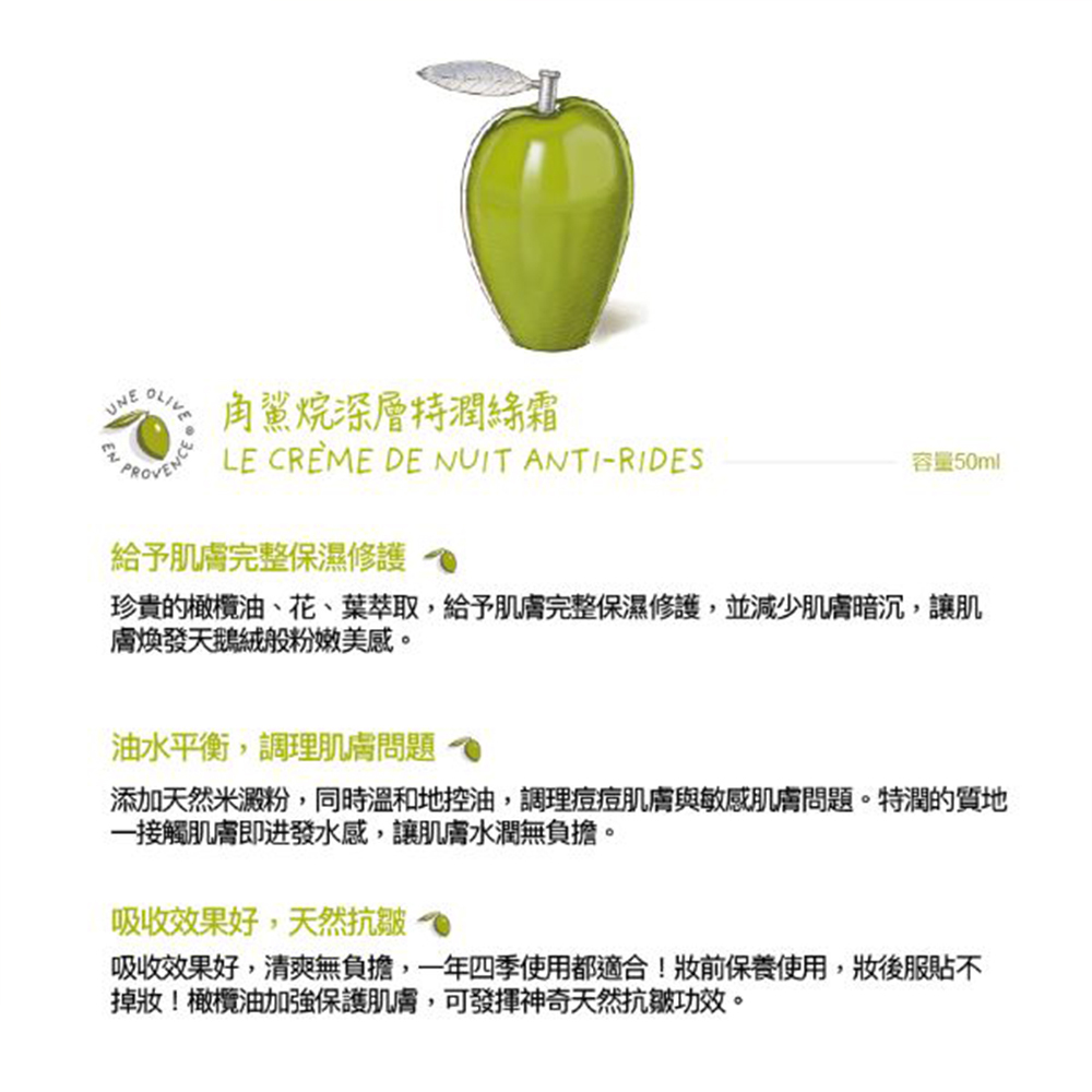 深層滋養肌膚,日霜能讓您的膚質柔細如絲綢地柔滑光澤。獨特的產品配方,來自整棵橄欖樹的植株;豐富的特級初榨橄欖油能加強保護肌膚,而橄欖油中植物性角鯊烷的水合作用,具有深層保溼皮膚的功效。