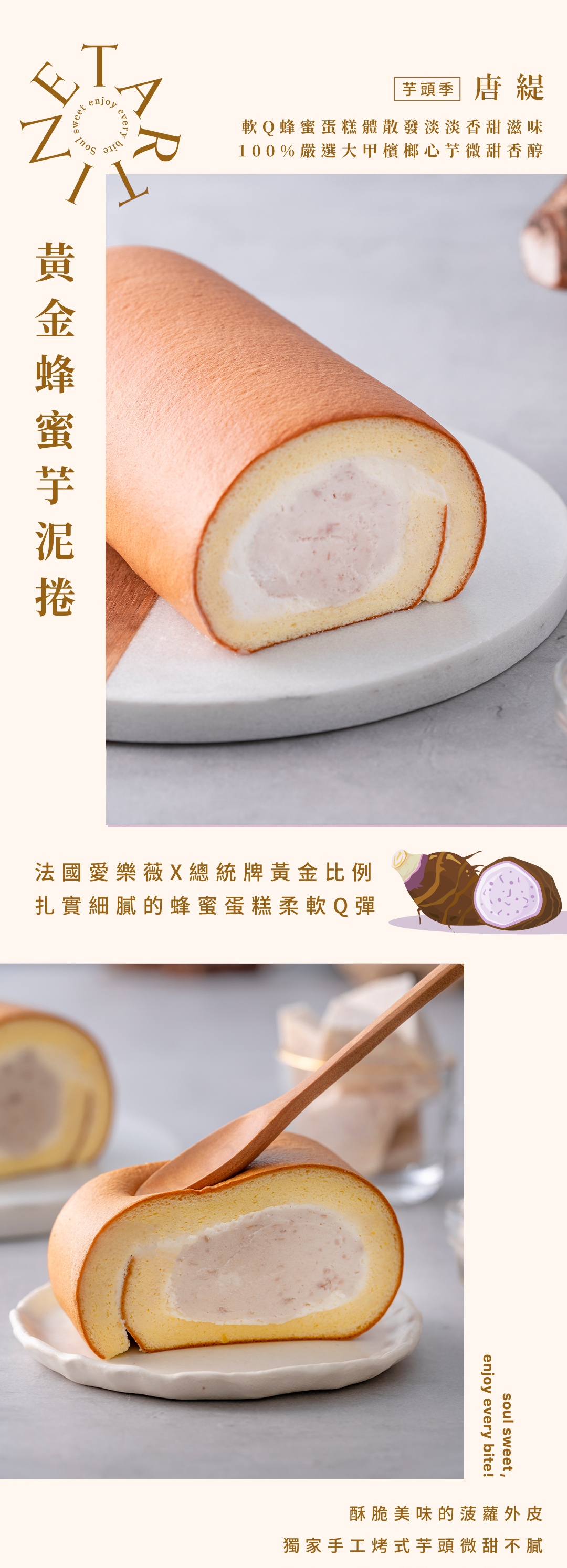 加入土雞蛋,讓蜂蜜蛋糕體味道更加升級!以嚴選大甲芋頭製成芋泥,保留些許芋頭顆粒在其中,厚厚實實的芋泥內餡,讓芋頭控為之瘋狂!(蛋奶素)