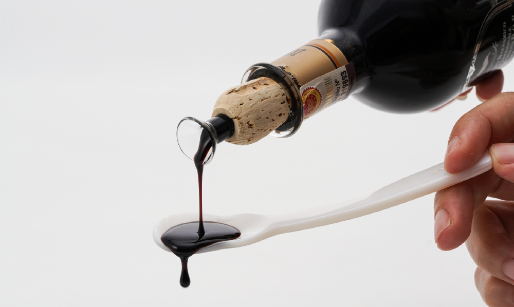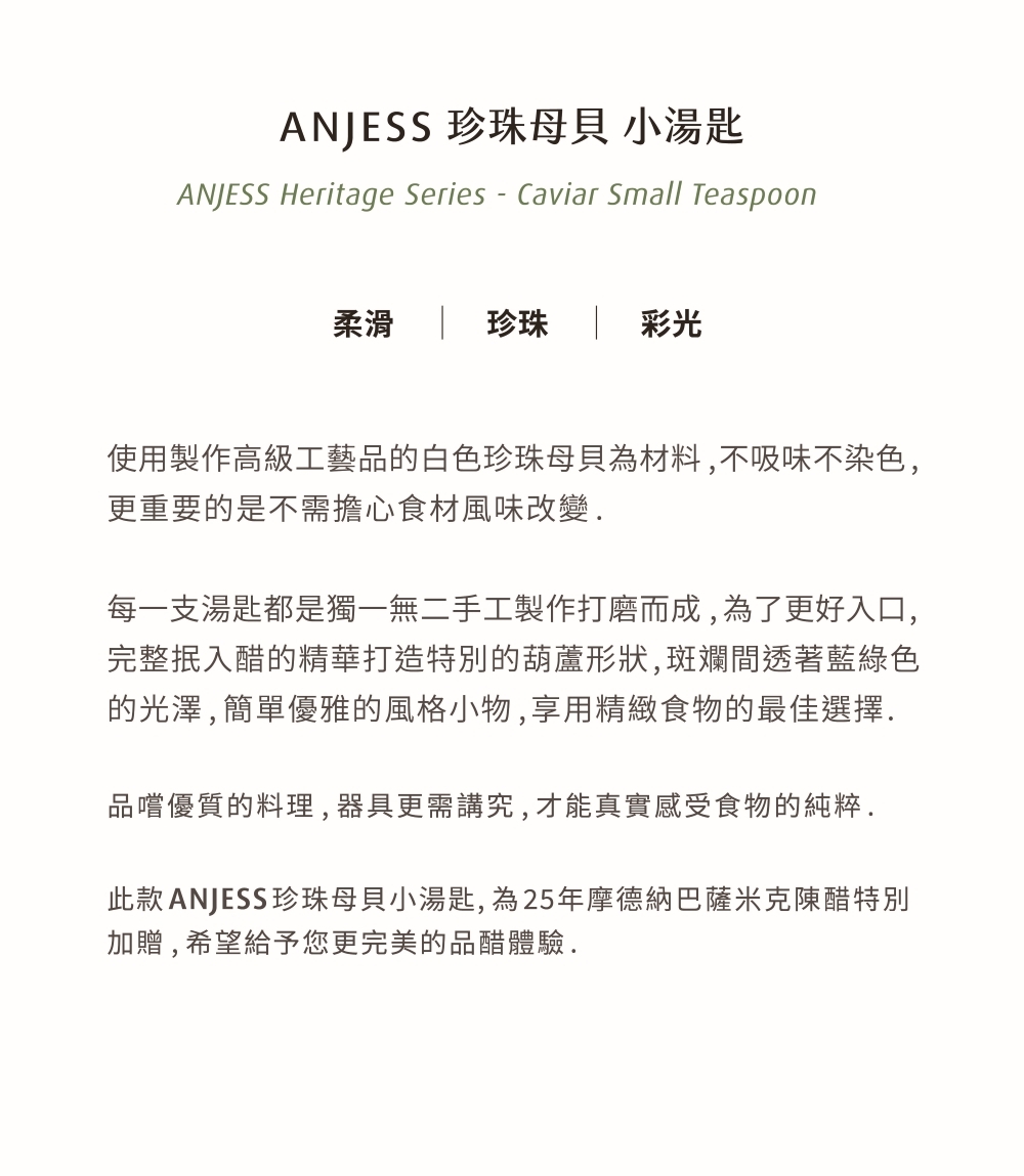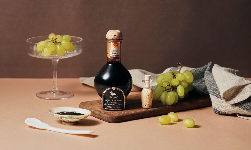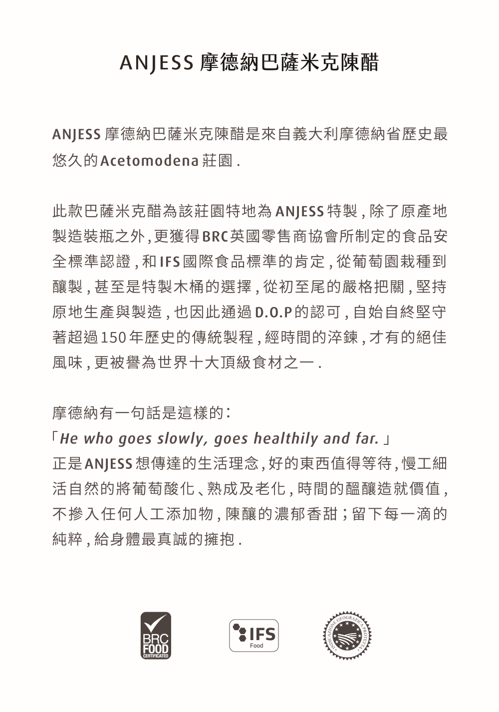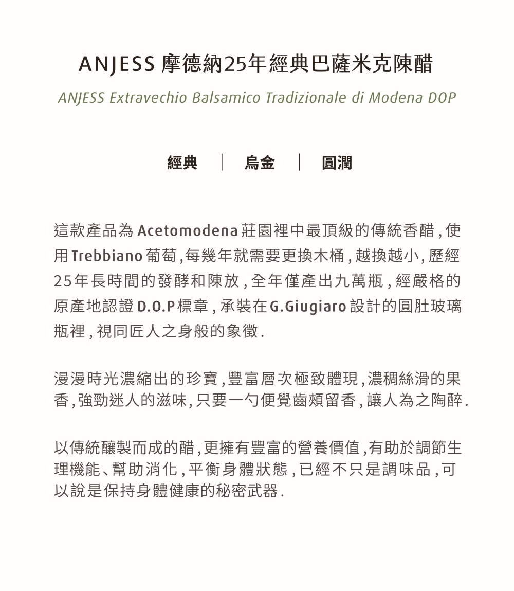 這款產品為莊園裡中最頂級的傳統香醋,使用Trebbiano 葡萄 , 每幾年就需要更換木桶 , 歷經25年長時間的發酵和陳放 , 全年僅產出九萬瓶 , 經嚴格的原產地認證 D.O.P標章 , 承裝在G. Giugiaro 設計的圓肚玻璃瓶裡 , 視同匠人之身般的象徵 .
