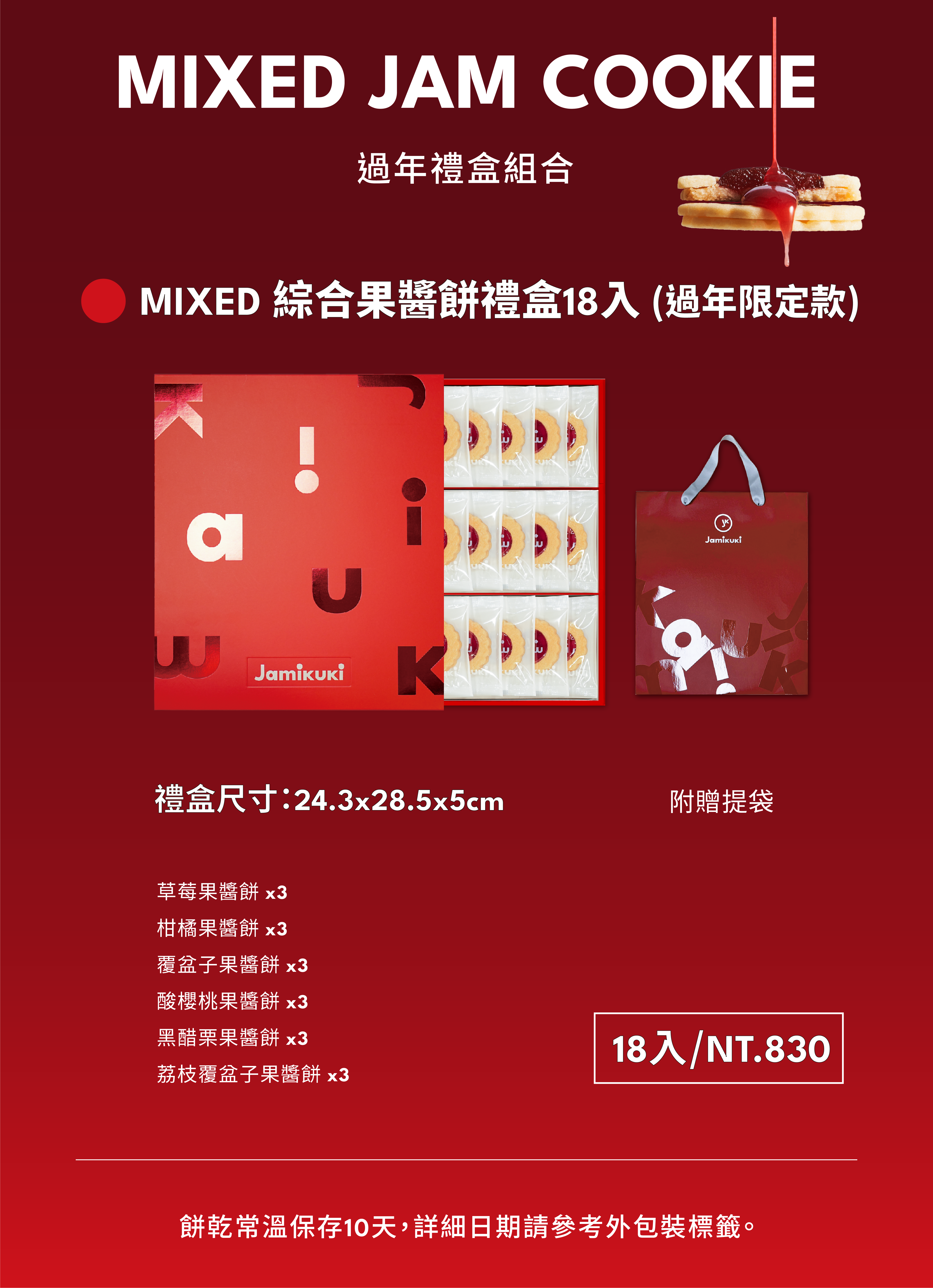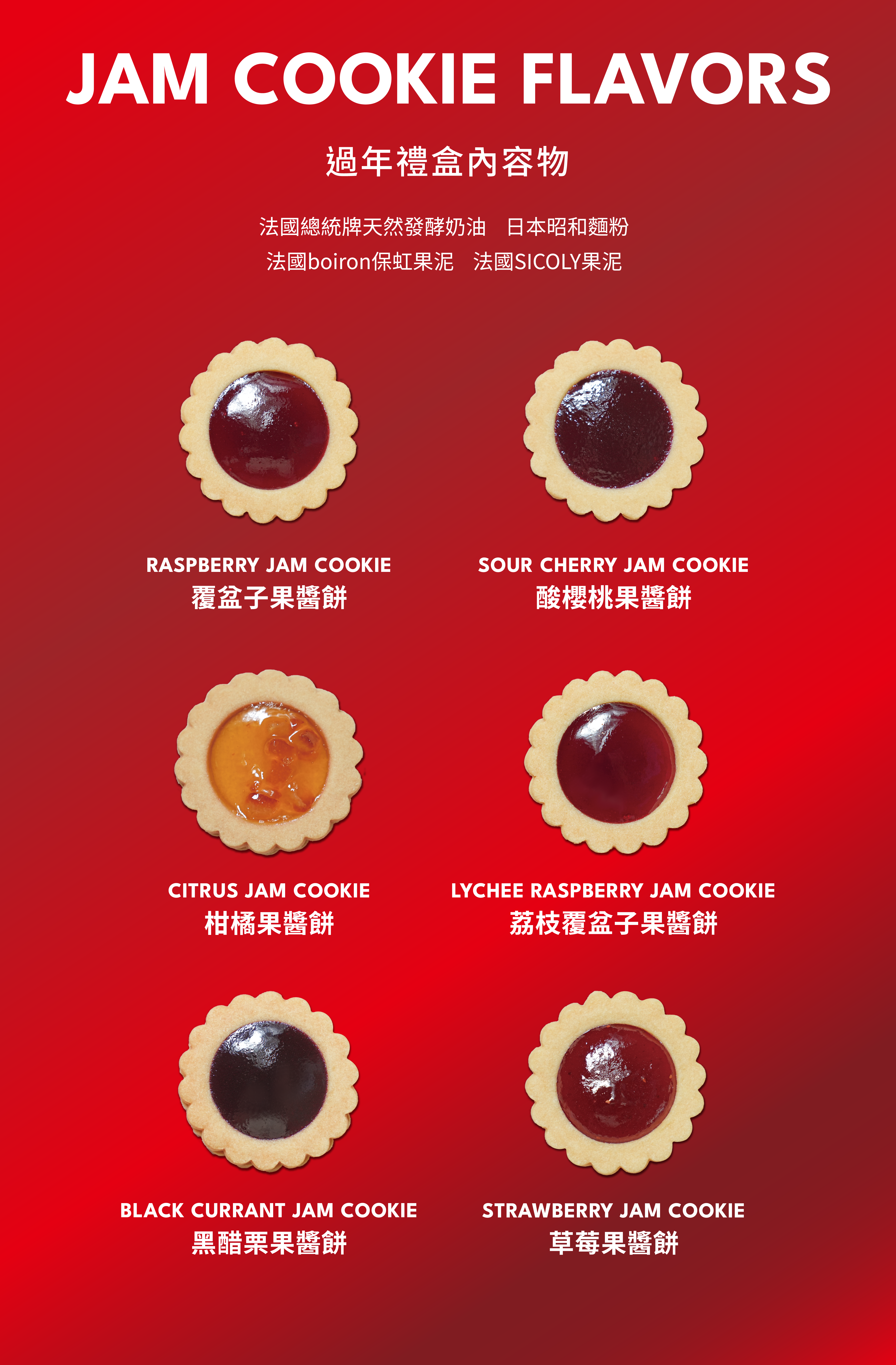 品項: 18入 覆盆子果醬餅x3、酸櫻桃果醬餅x3、柑橘果醬餅x3、荔枝覆盆子果醬餅x3、黑醋栗果醬餅x3、草莓果醬餅x3