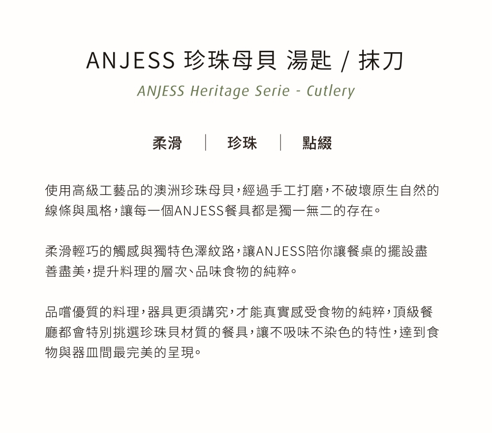 使用高級工藝品的澳洲珍珠母貝,經過手工打磨,不破壞原生自然的線條與風格,,讓每一個ANJESS餐具都是獨一無二的存在。