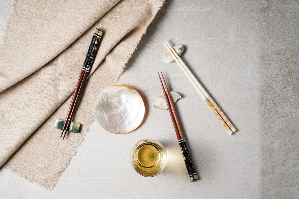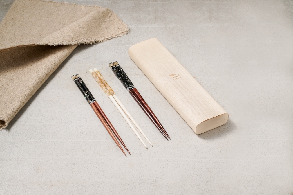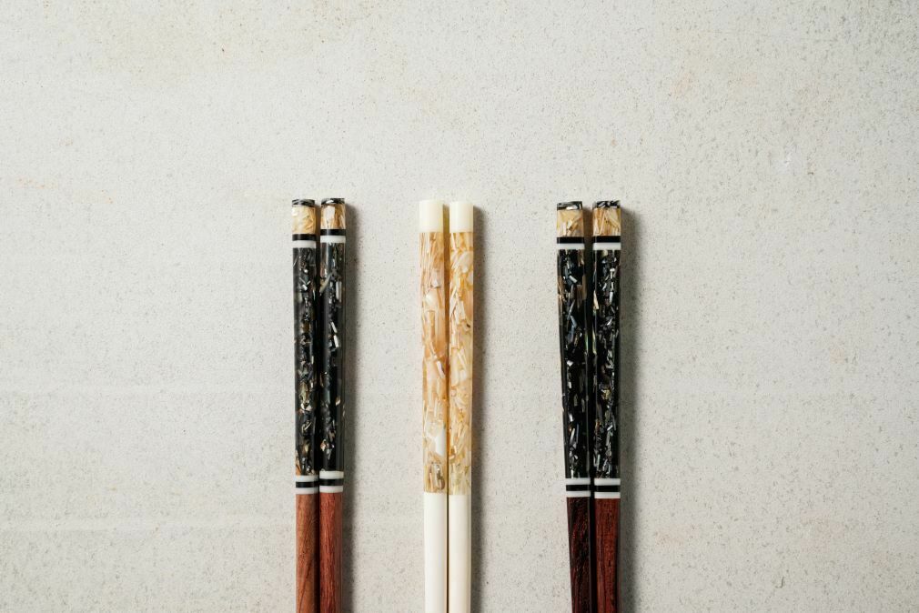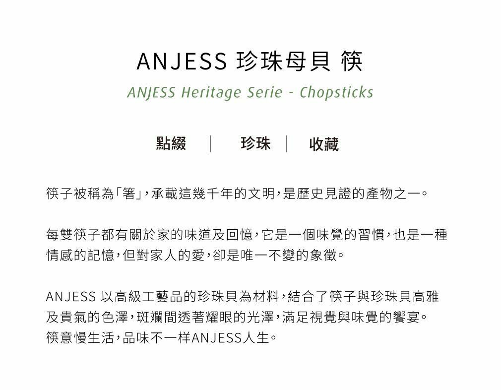 ANJESS 以高級工藝品的珍珠貝為材料,結合了筷子與珍珠貝高雅及貴氣的色澤,斑斕間透著耀眼的光澤,滿足視覺與味覺的饗宴。