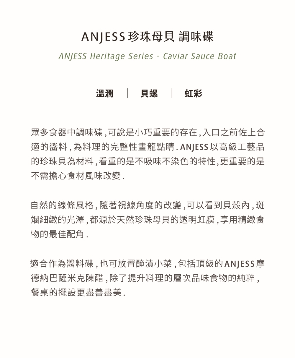 調味碟可說是小巧重要的存在 , 入口之前佐上合適的醬料 , 為料理的完整性畫龍點睛 .ANJESS 看重的是不吸味不染色的特性 , 更重要的是不需擔心食材風味改變 .