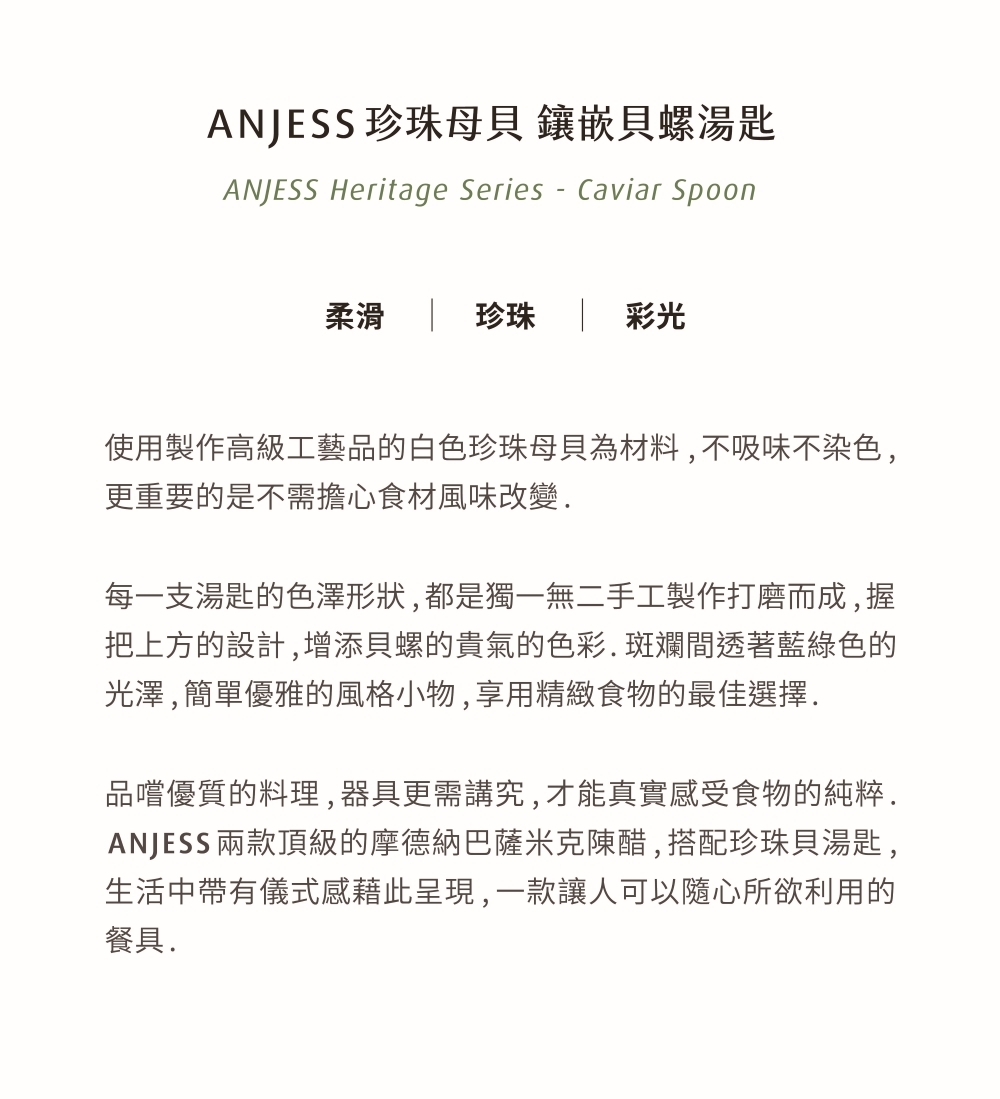 搭配 ANJESS 兩款頂級的摩德納巴薩米克陳醋再適合不過 , 使用來自澳洲的珍珠母貝為材料 , 獨一無二手工製作打磨而成 , 不吸味不染色 , 更重要的是不需擔心食材風味改變 .