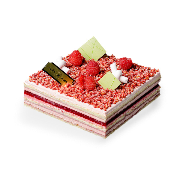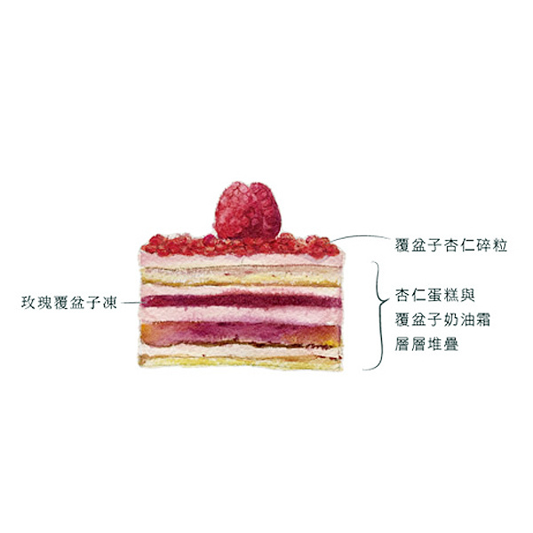 🎂 蛋糕成分:覆盆子杏仁脆粒、玫瑰覆盆子凍、杏仁蛋糕、覆盆子奶油霜、覆盆子白蘭地
