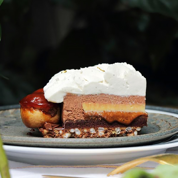 香草白巧克力香緹 /巧克力慕斯 /鳳梨百香果慕斯 /焦糖杏仁餡 /蕎麥米香酥脆派皮 /焦糖巧克力泡芙 /馬達加斯加香草 /法芙娜64%巧克力