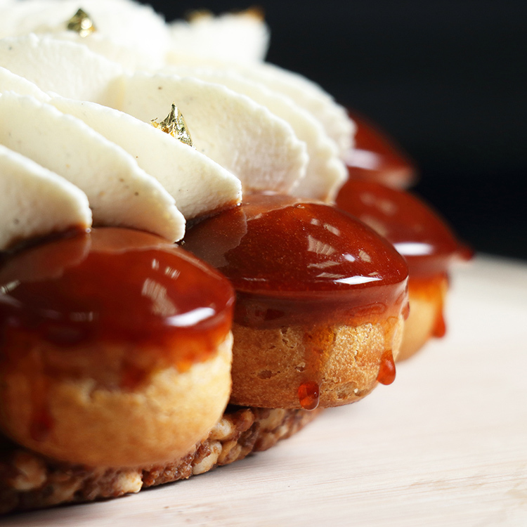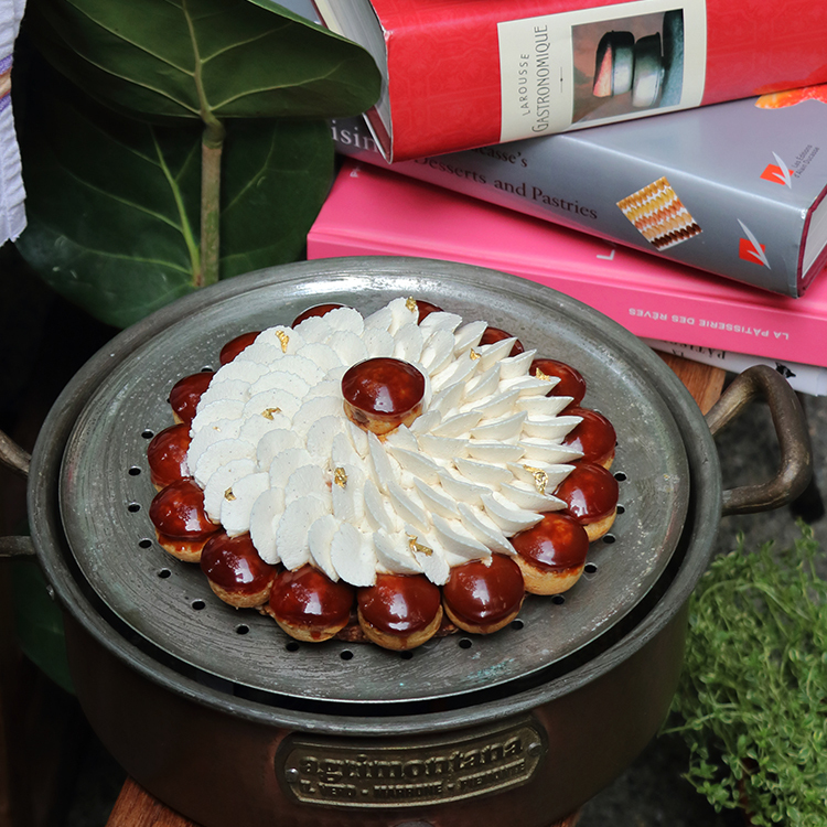#聖多諾黑泡芙塔直接空降人生最好吃生日蛋糕真正的苦,總是能在最後化成甘甜。法芙娜尼昂寶與孟加里兩種不同巧克力的苦甘,為焦糖巧克力泡芙與慕斯帶來了靈魂。蕎麥米香脆餅賦予深度的烤焙香氣、鳳梨百香果奶油餡的酸香平衡了整體的骨幹。