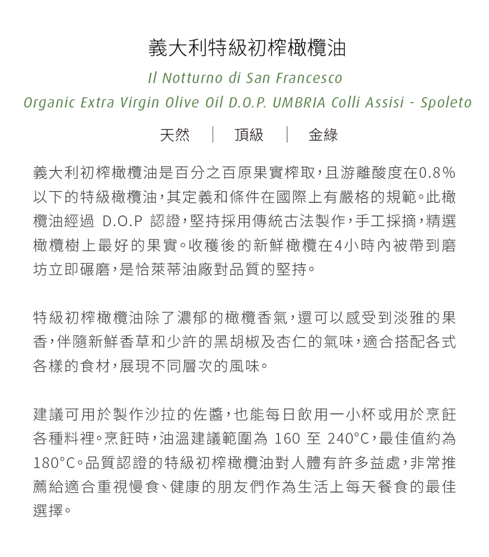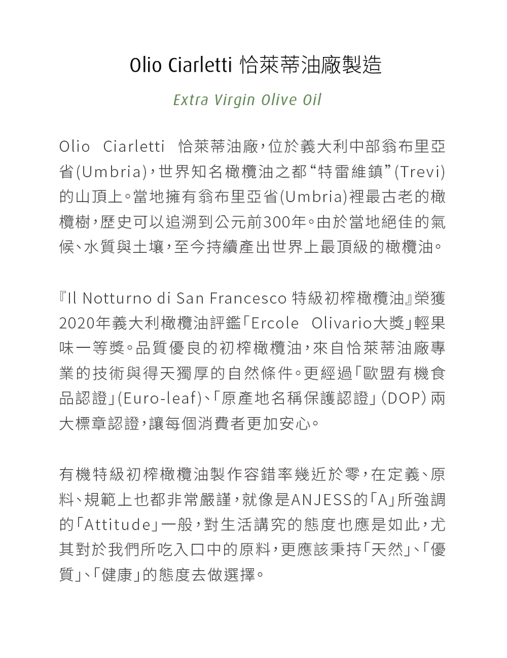 Olio Ciarletti 恰萊蒂油廠,位於義大利中部世界知名橄欖油之都“特雷維鎮”(Trevi)的山頂上。『Il Notturno di San Francesco 特級初榨橄欖油』榮獲2022 年 Ercole Olivario 輕果味一等獎,也經過「歐盟有機食品認證」(Euro-leaf) 、「原產地名稱保護認證」(DOP)兩大標章認證,且游離酸度在0.8%以下。淡雅的果香,伴隨新鮮香草和少許的黑胡椒及杏仁的氣味,適合搭配各式各樣的食材,展現不同層次的風味