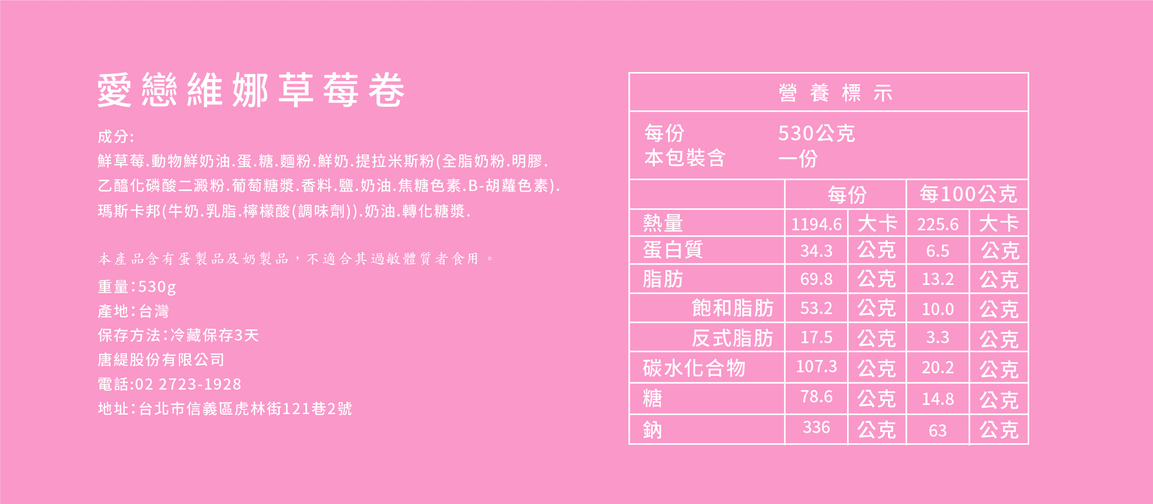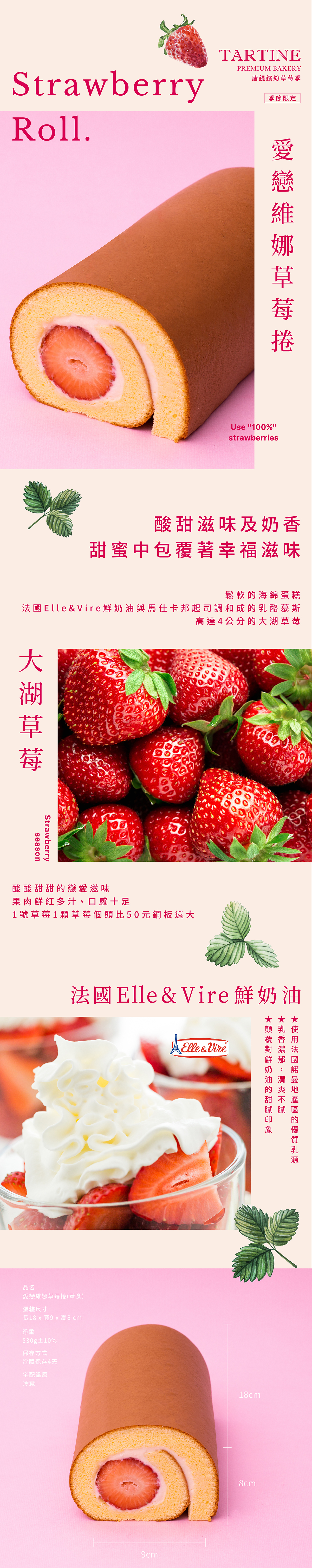 用綿軟的戚風蛋糕,把草莓的美好捲進你心裡~香醇清爽的愛樂薇奶油內餡,中和草莓天然的酸甜味,堆疊出更高的香氣層次!