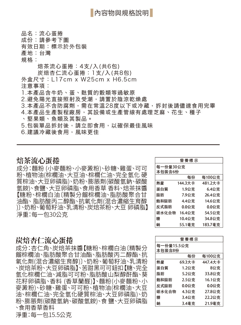 焙茶流心蛋捲6包、炭焙杏仁流心蛋捲8包、手提袋1個
