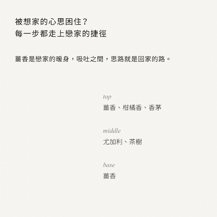 薑香是戀家的暖身動作,吸吐之間,想家的次數又比想念戀人多了一些。對,你沒看錯,是薑香,我們放了薑香。除了具備暖心潤肺的功效,也可以舒緩呼吸,讓你回到家,用味覺做一場心靈SPA。在臥房裡噴灑,彷彿在牆上安了一座壁爐般溫暖。HiOO以想像力打開可能性的居家香氛品牌,致需要空呼吸的人們,好好換氣。